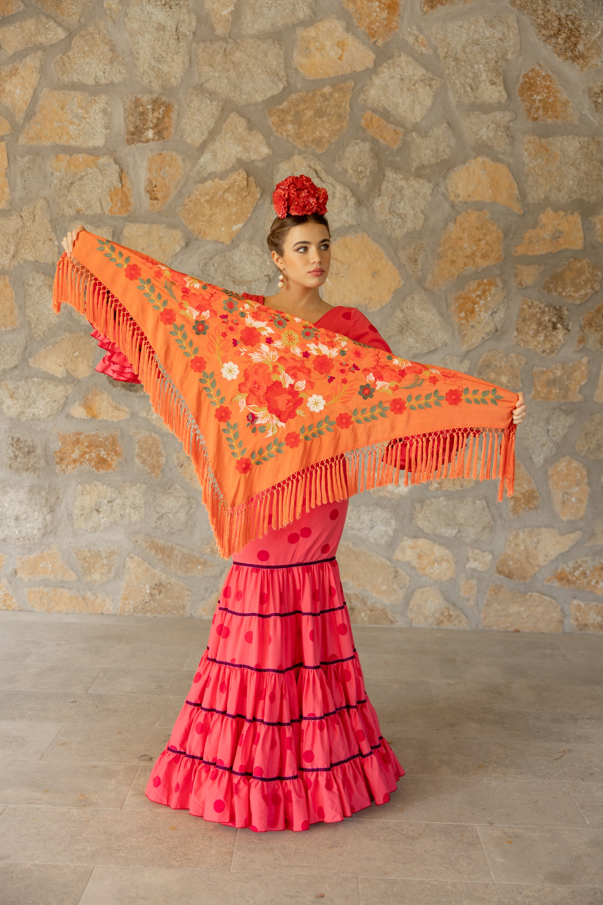 Nuestros mantones de seda son piezas únicas y artesanales. Cada uno mide entre 145 cm y 150 cm de ancho y entre 63 cm y 65 cm de alto, con flecos de aproximadamente 30 a 35 cm, elaborados en seda viscosa y en tonalidad a juego con el mantón.