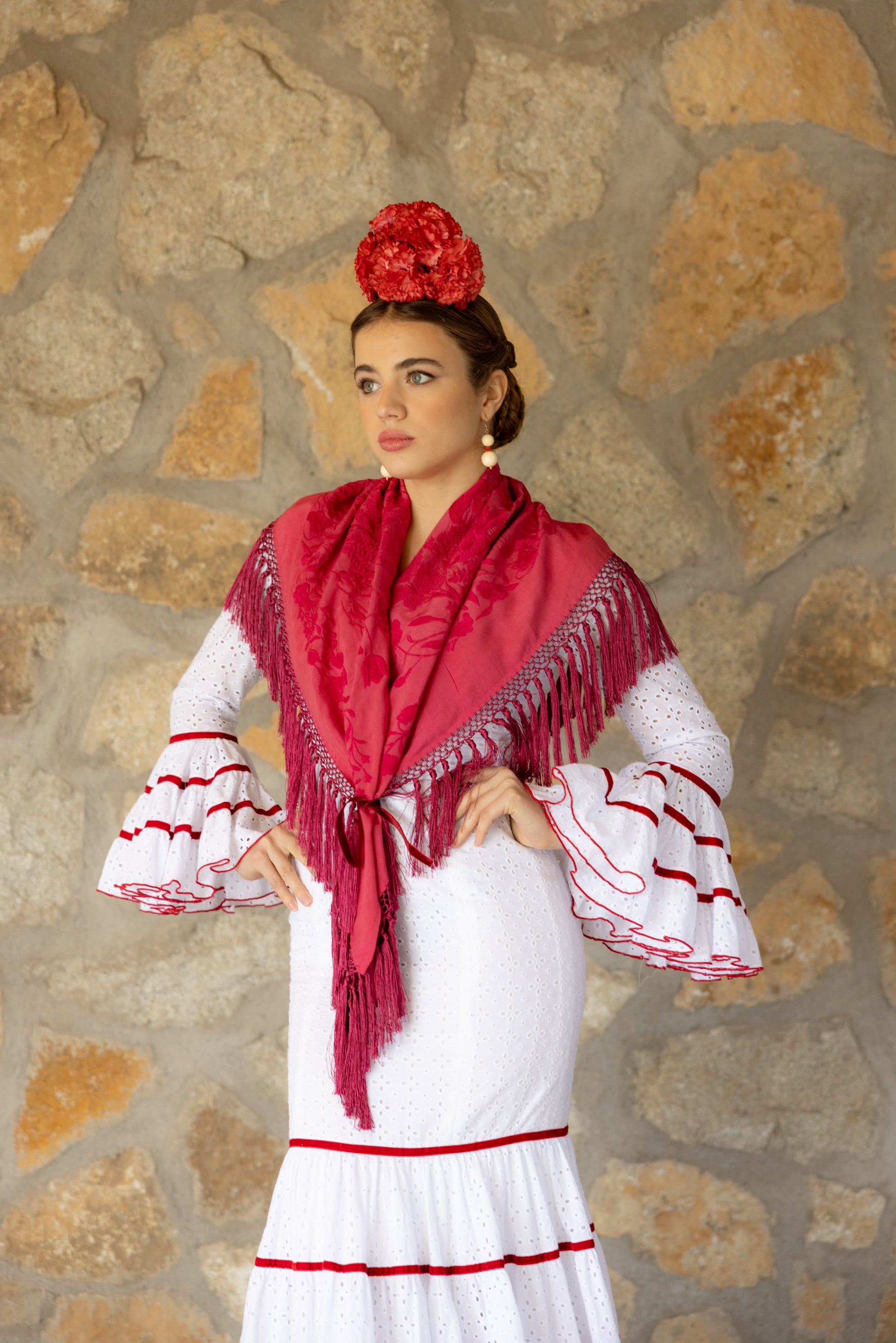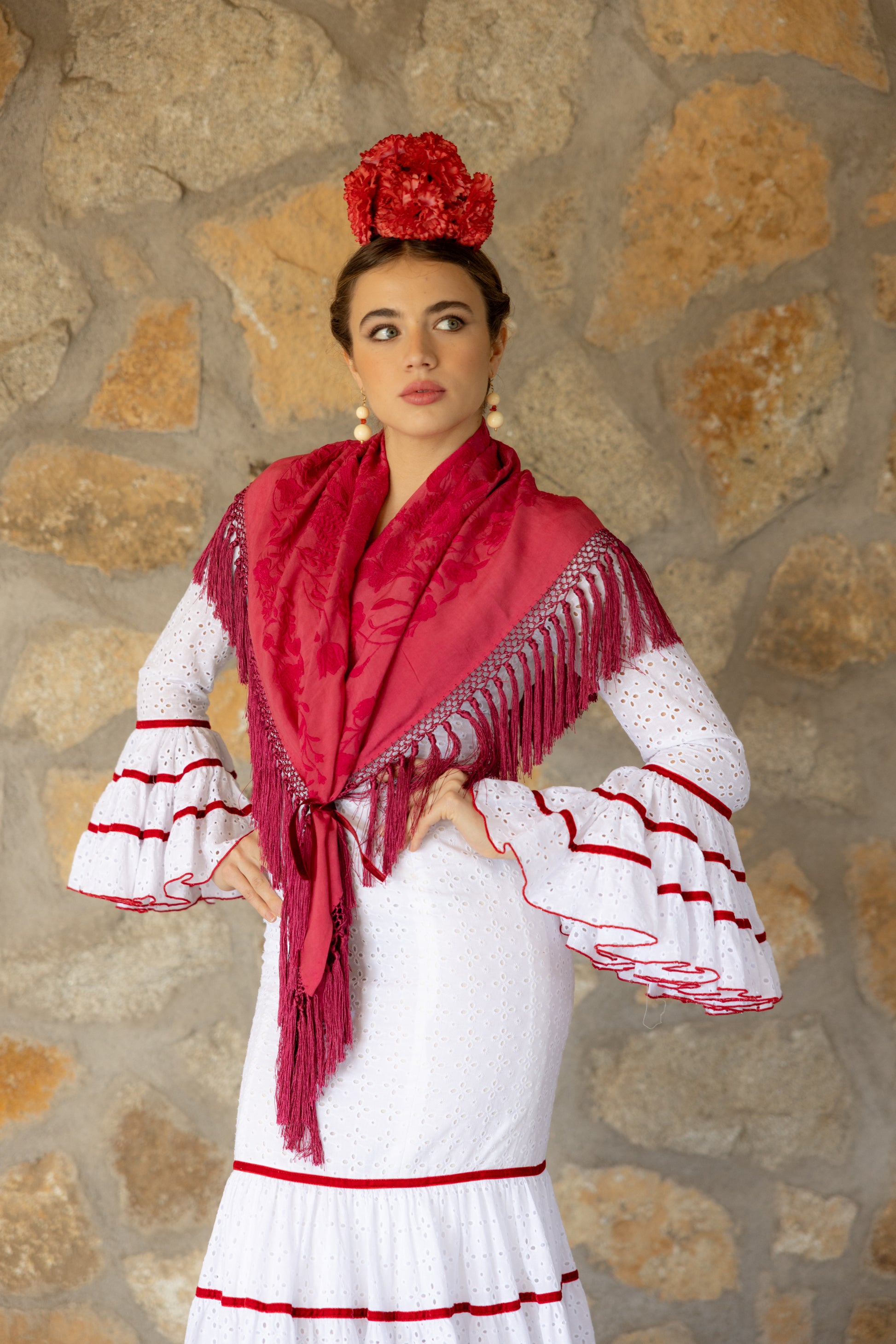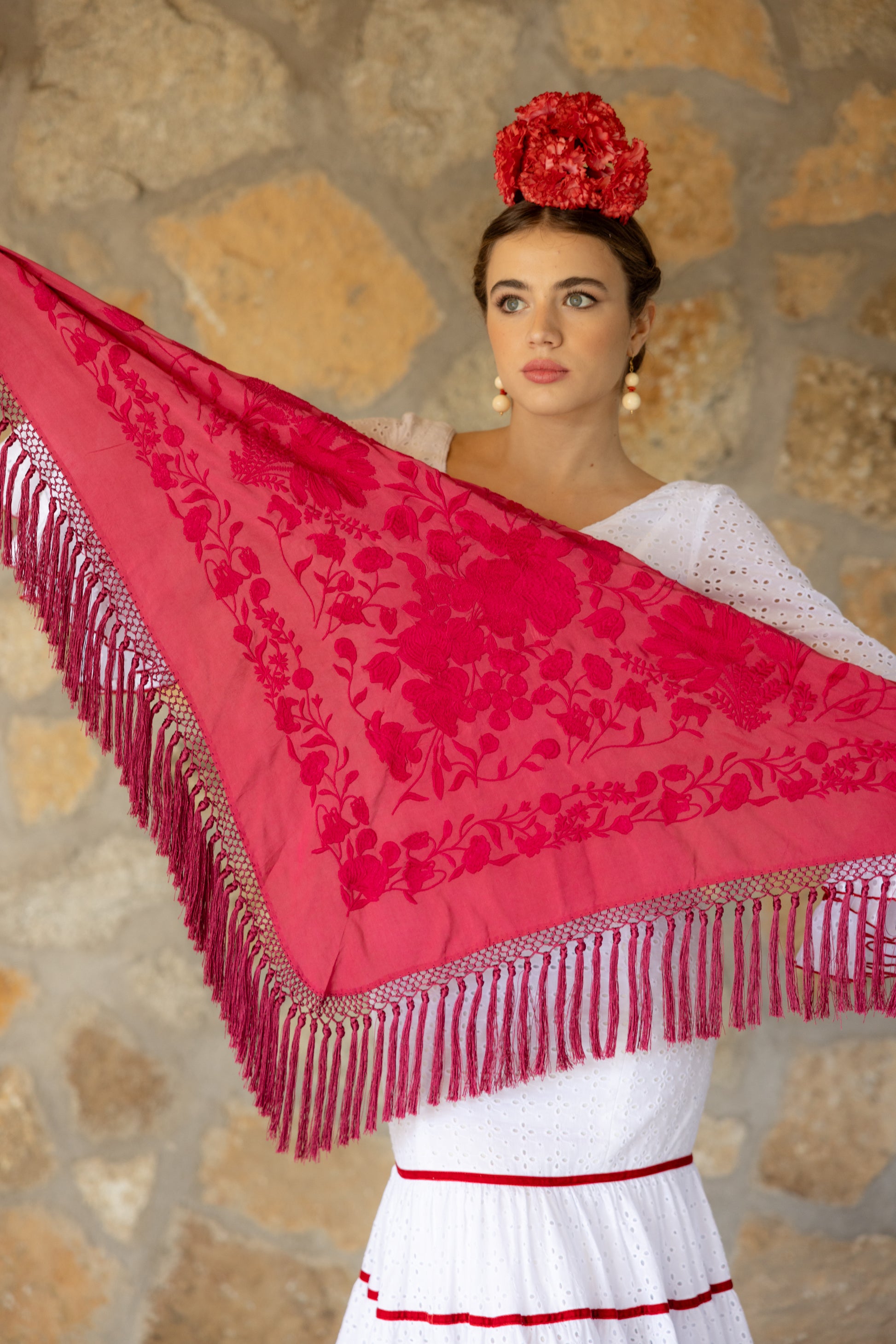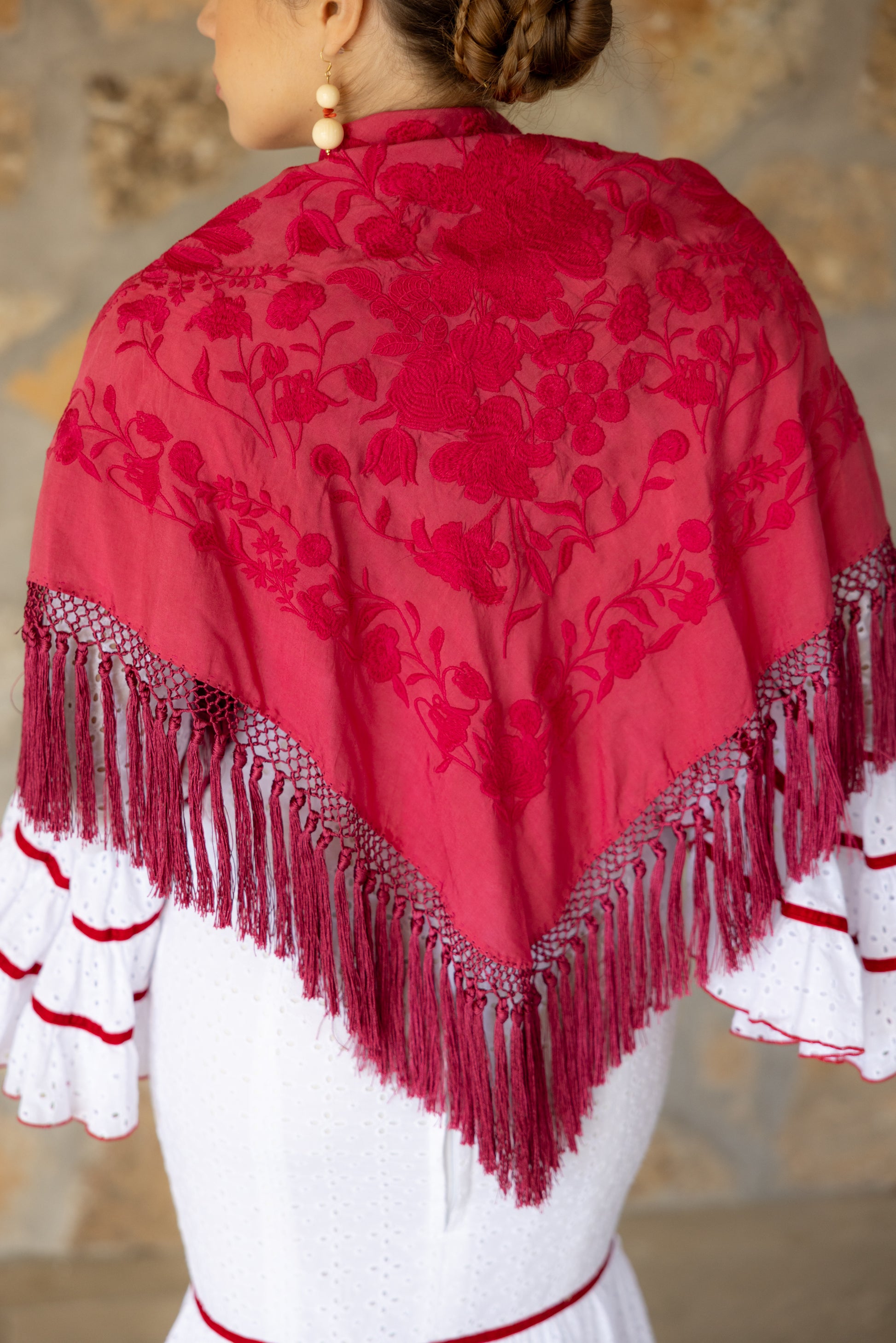 Nuestros mantones de seda son piezas únicas y artesanales. Cada uno mide entre 145 cm y 150 cm de ancho y entre 63 cm y 65 cm de alto, con flecos de aproximadamente 30 a 35 cm, elaborados en seda viscosa y en tonalidad a juego con el mantón.