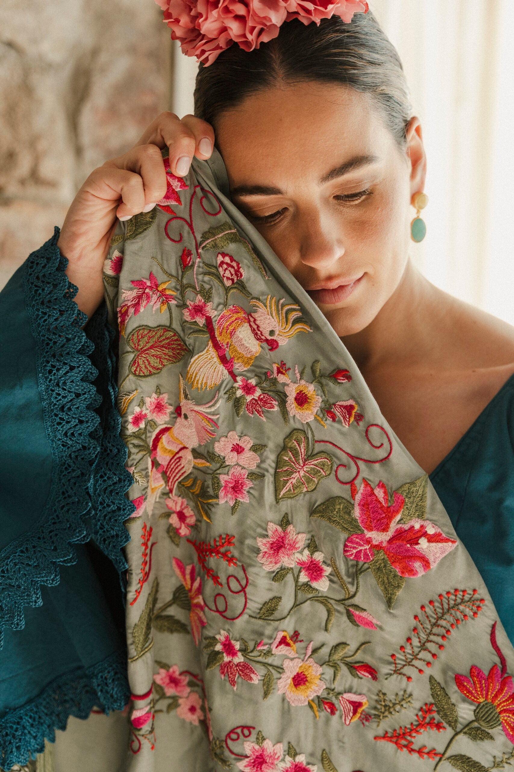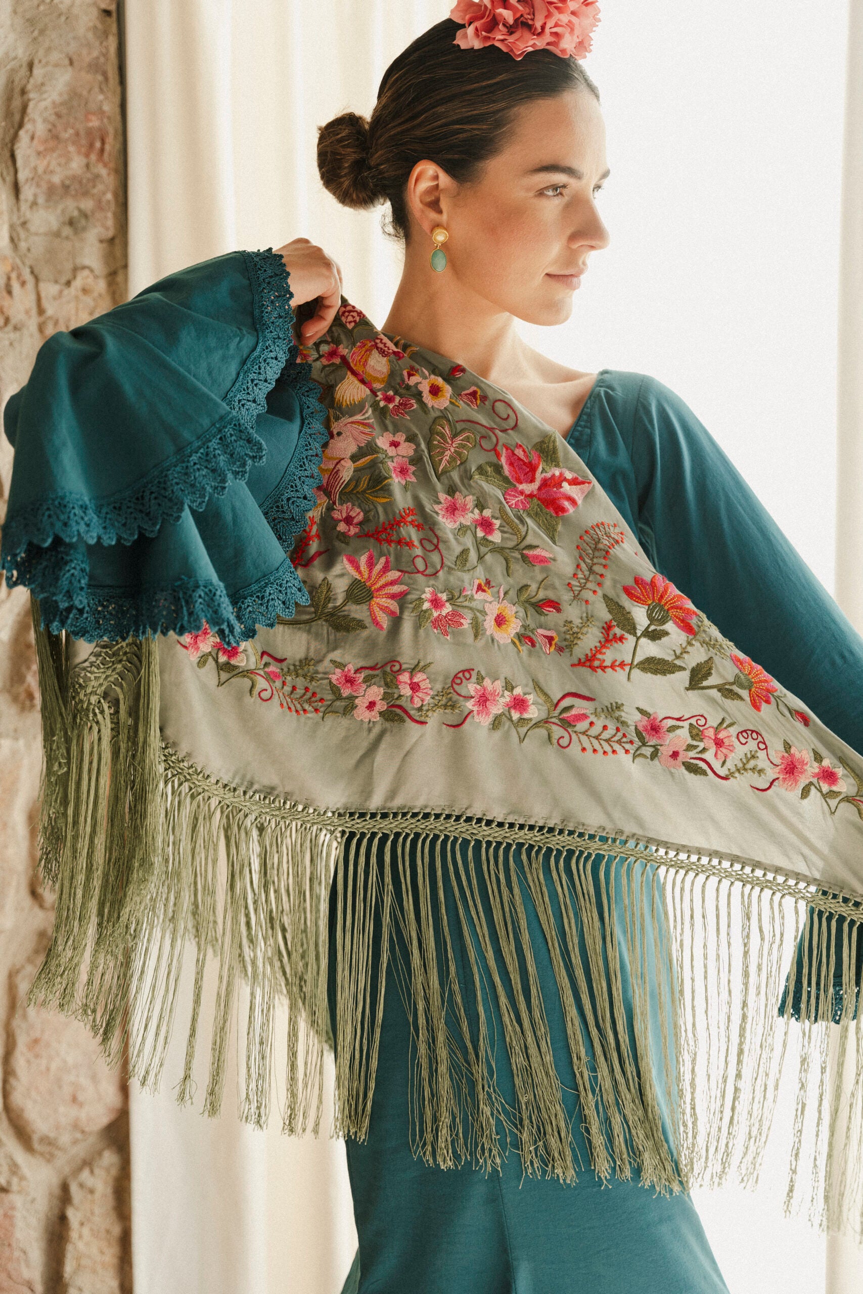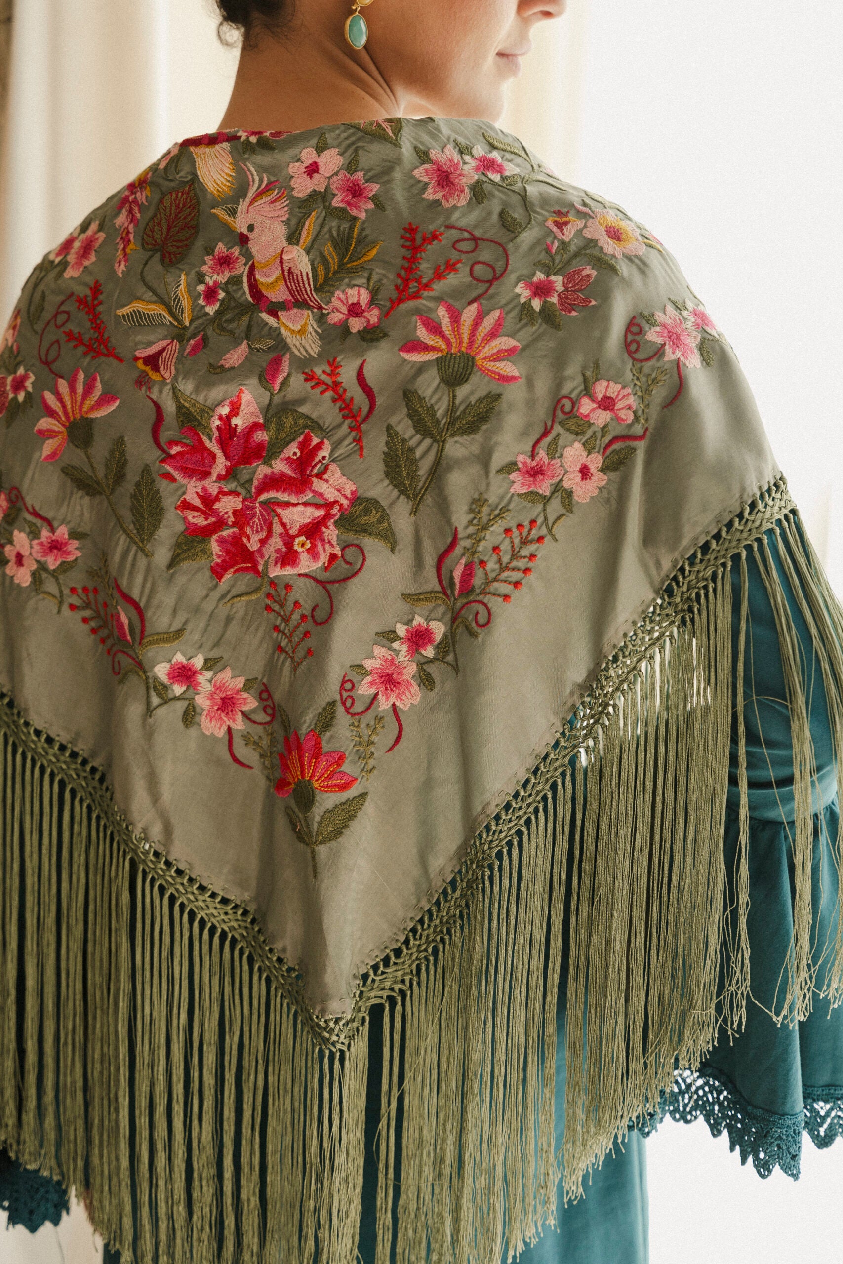 Nuestros mantones de seda son piezas únicas y artesanales, cuidadosamente bordados a mano. Cada uno mide entre 145 cm y 150 cm de ancho y entre 63 cm y 65 cm de alto, con flecos de aproximadamente 30 a 35 cm, elaborados en seda viscosa y en tonalidad a juego con el mantón.