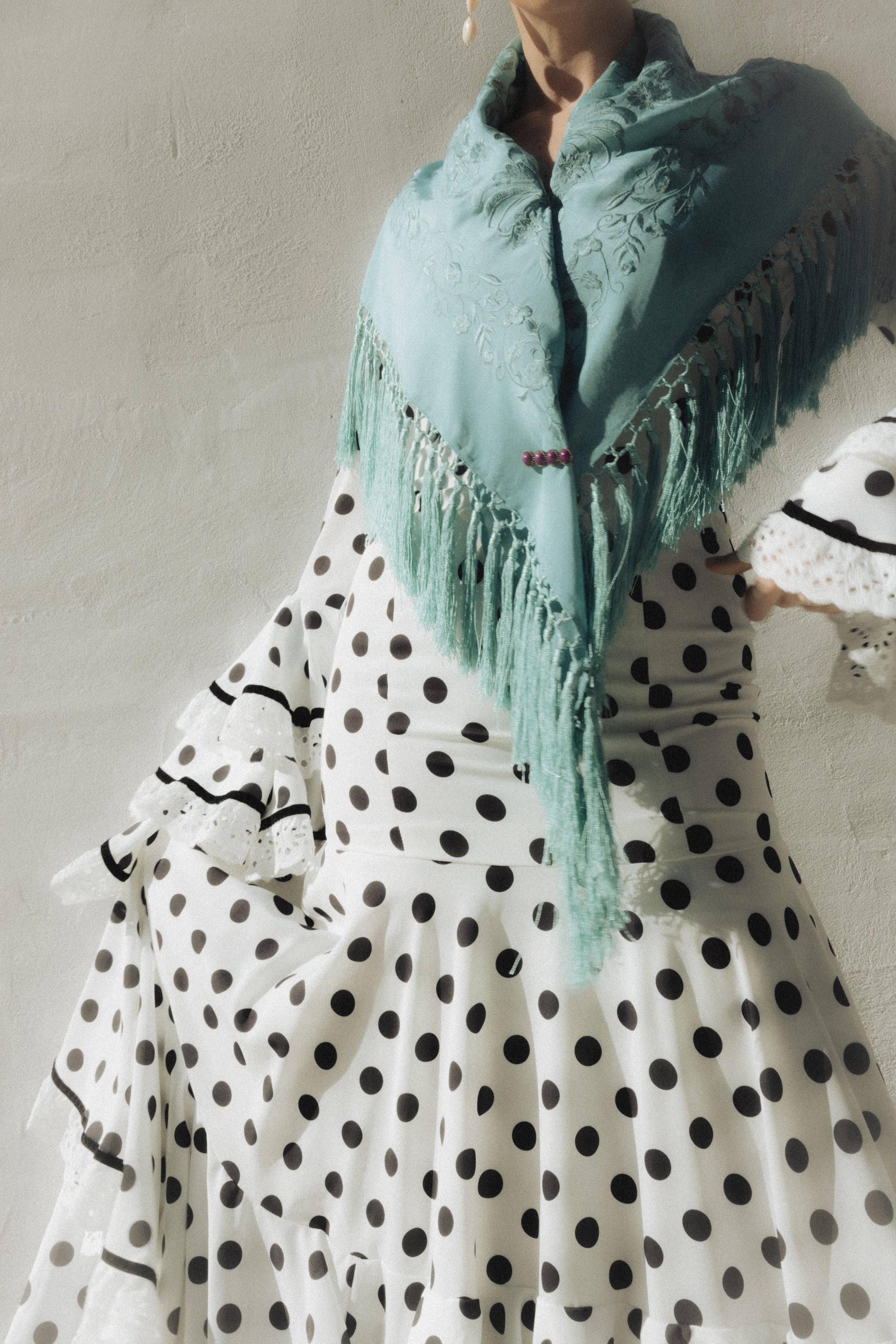 Traje de flamenca confeccionado en georgette blanco con lunar estampado en color negro, los adornos son de terciopelo negro de 9 mm y tiras bordadas de 4 cm. Enagua de popelín con bolsillo.