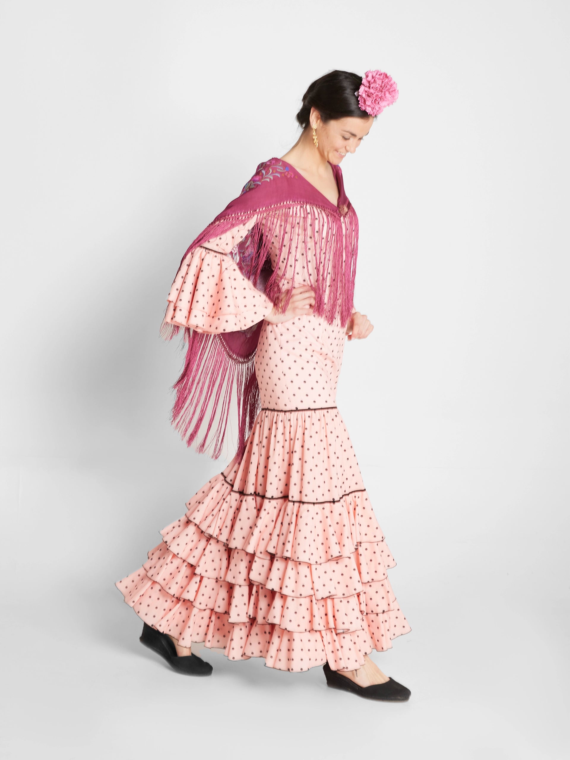 Traje flamenca rosa palo lunares negros. Tejido batista. Detalles en terciopelo negro. La modelo mide 1,79. Todos nuestros diseños pueden ajustarse hasta dos tallas menos o agrandarse hasta dos tallas más, si te gusta pero no es tu talla, contáctenos. Solo incluye el traje, accesorios hay que alquilarlos o comprarlos a parte.